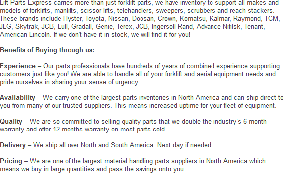 For your entire fleet of lift trucks, we provide the best prices on all our parts. For a price estimate on a part or attachment we offer, please get in touch with us at: